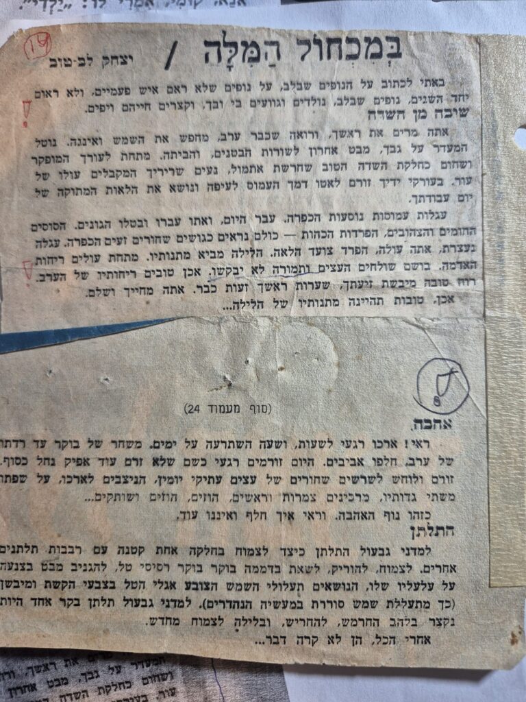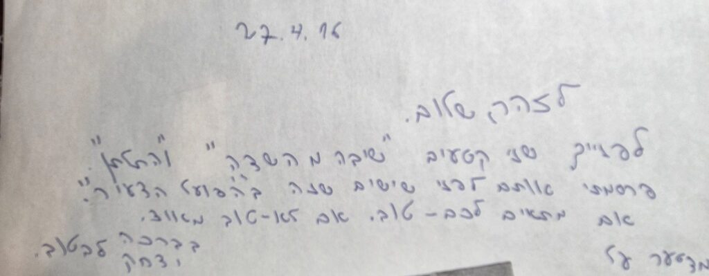 "זוהר – לפניך שני קטעים "שיבה מהשדה" ו"התלתן". פרסמתי אותם לפני 60 שנה ב"הפועל הצעיר". אם מתאים לכם לפרסמם – טוב, אם לא מתאים, טוב מאוד". בברכה יצחק לב טוב.