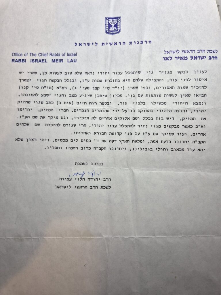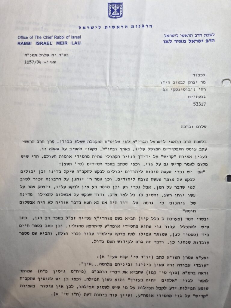 כיהודי לכול דבר וענין – חששתי שמא לא נהגתי כשורה – פניתי לרב הראשי דאז – הרב מאיר לאו – במכתב מפורט מאד השיבו מלשכת הרב כי " יש מקום לאמר קדיש גם על גוי" ושניתן להתפלל עבור גוי שהוא מחסידי אומות עולם. לכן אין איסור באמירת " קדיש" על גוי מחסידי אומות העולם".